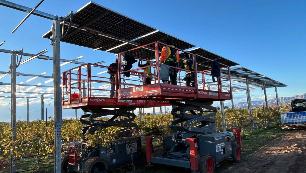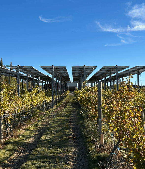 La structure Agri-PV est installée au-dessus des rangs de vignes, permettant à la lumière naturelle d’atteindre le couvert végétal tout en produisant de l’énergie propre sur place. L’installation s’intègre dans un effort scientifique plus large visant à mieux comprendre le comportement des vignobles sous conditions Agri-PV.